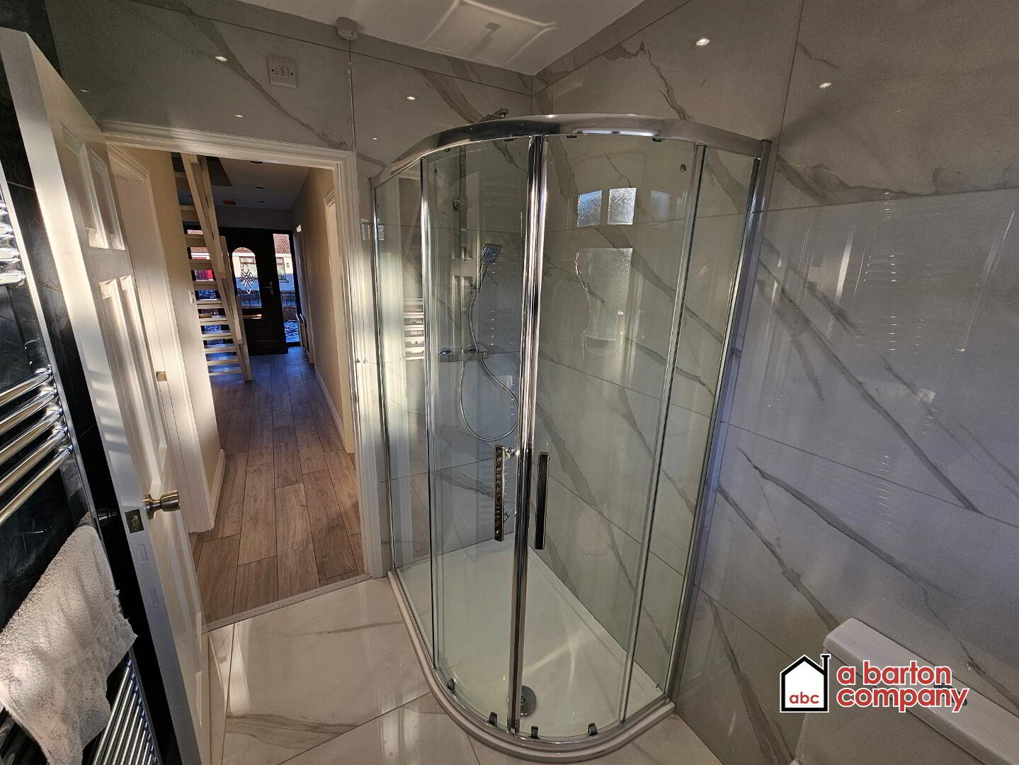 Three-piece, luxury, white shower suite comprising: Glazed corner shower unit with thermostatically controlled shower, wash hand basin with vanity unit and low-flush, push button W.C. Fully tiled floors and walls. Chrome towel radiator.
