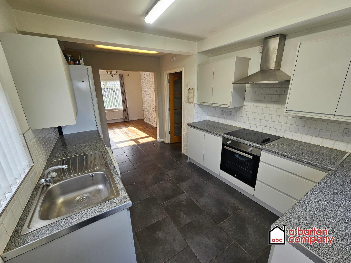 Newly refurbished, ‘block’ kitchen comprising floor and eye-level units and contrasting Formica work surfaces. Stainless steel sink and drainer. Integrated electric oven and hobs. Stainless steel extractor unit. Part ‘subway’ tiled walls. Ceramic tiled flooring. Space, plumbing and power for Fridge/Freezer, Washing Machine and Dishwasher. Towel radiator. White uPVC external side door.