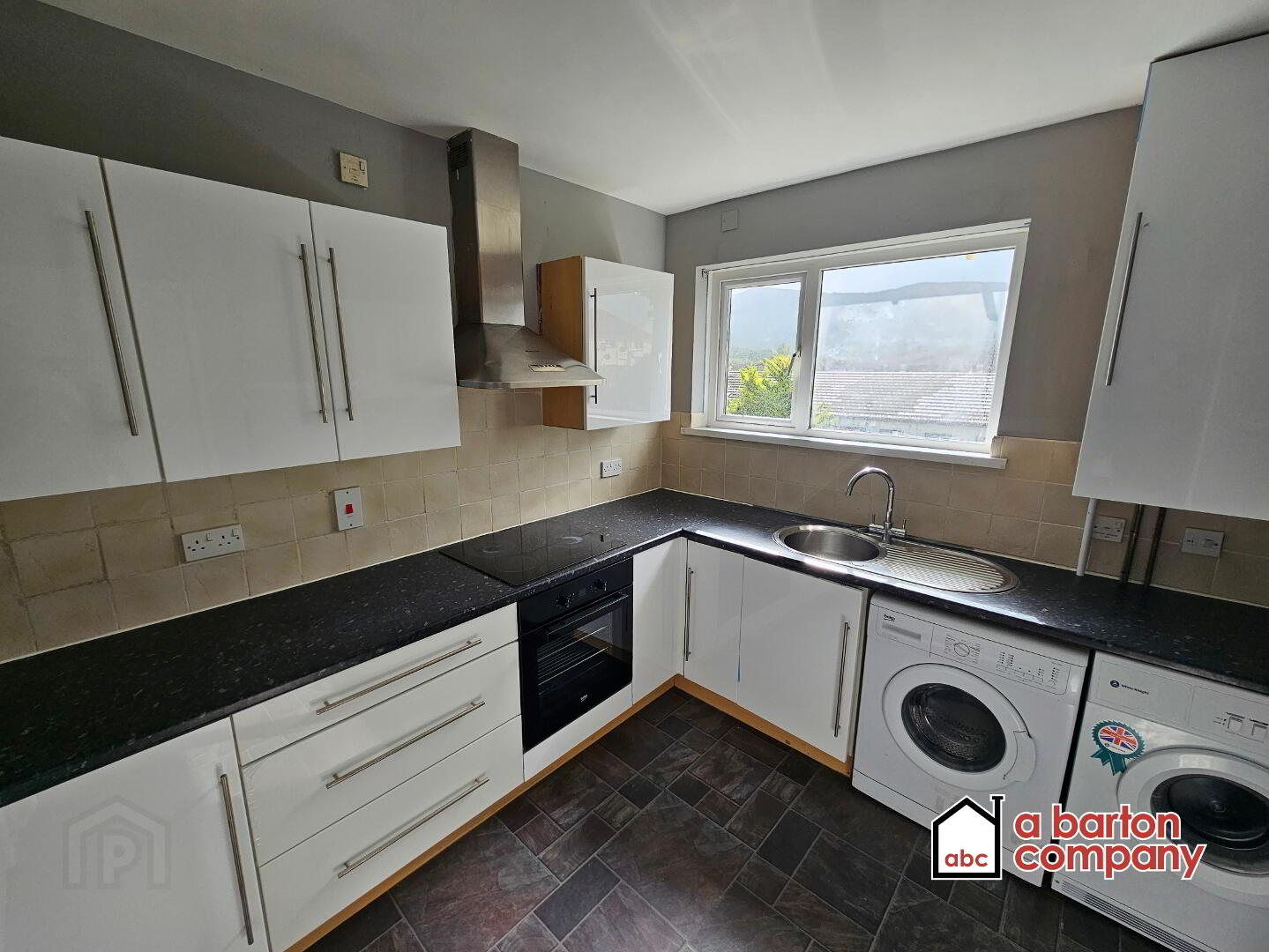 Recently refurbished, white block kitchen suite comprising floor and eye level units and contrasting worksurfaces. Integrated electric oven and halogen hobs. Stainless-steel extractor unit and canopy. Round stainless-steel sink and drainer. Space, plumbing and power for washing machine, tumble dryer and tall fridge freezer. Storage cupboard / hot press. Double radiator. Vinyl flooring. Tiled splashbacks. Centre light.