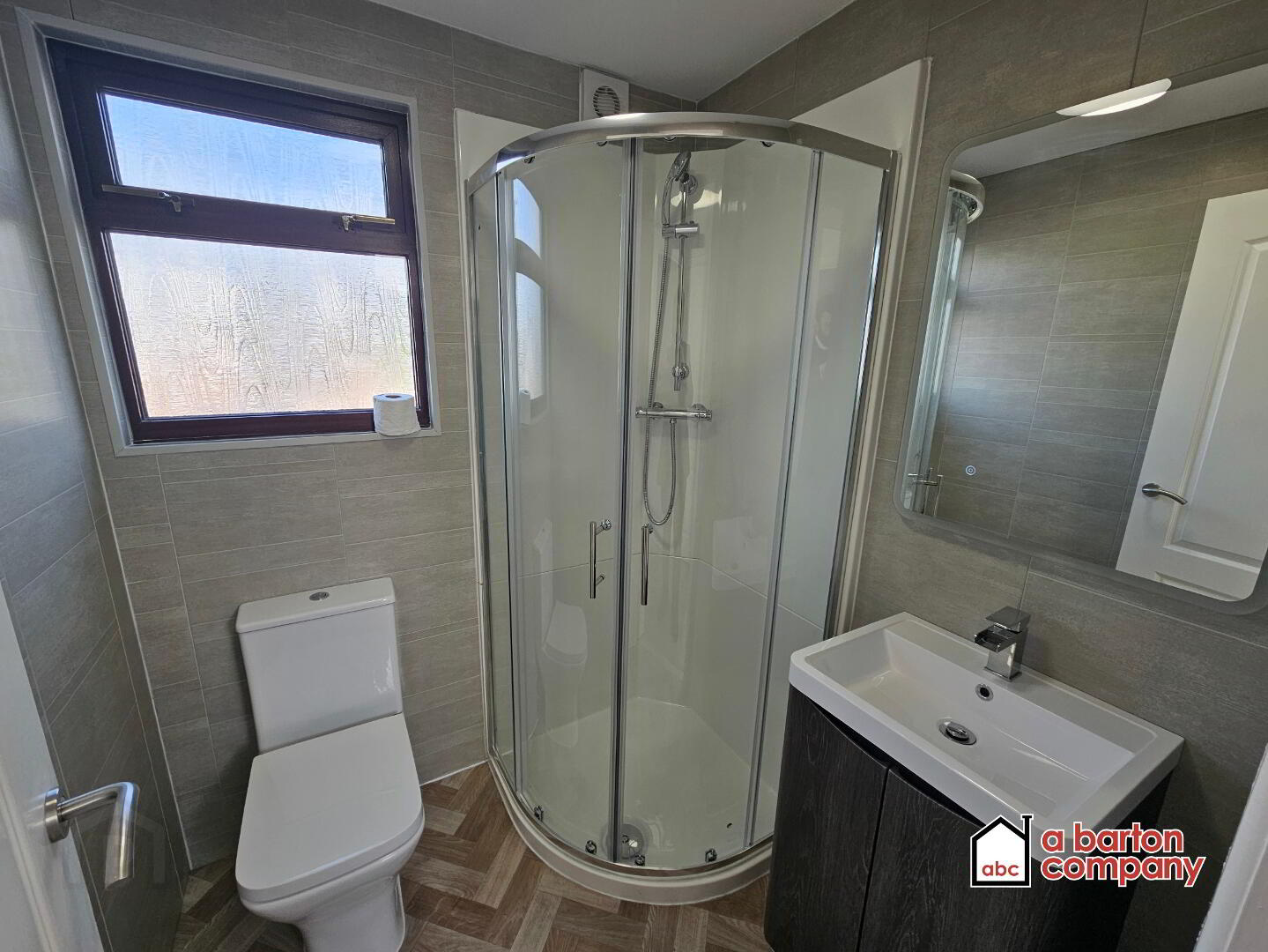 Brand new, white, three-piece suite comprising prefabricated shower enclosure with glazed screen surround, vanity wash hand basin and low-flush, push-button W.C. Thermostatically controlled mains shower unit. Fully panelled walls. Electric, illuminated vanity mirror. Towel radiator.
